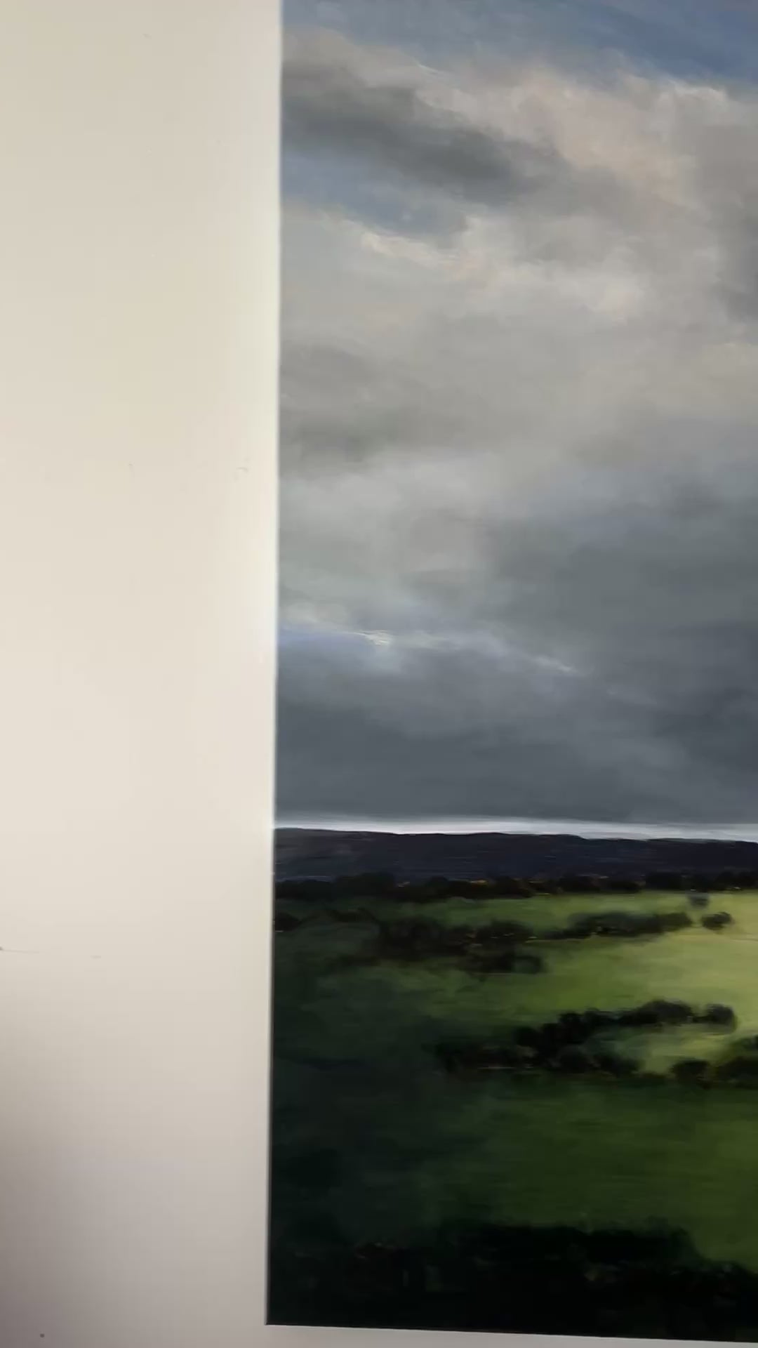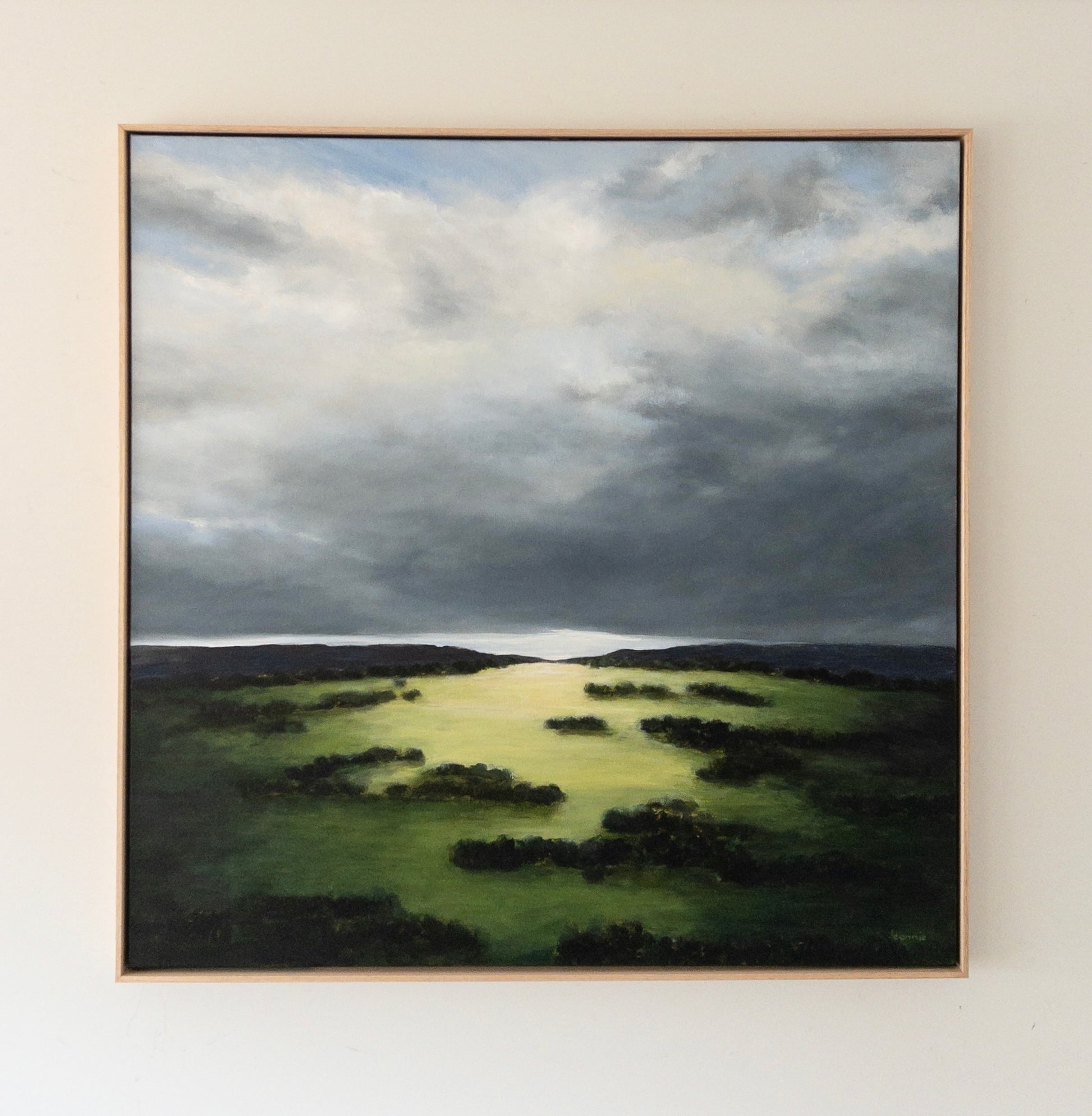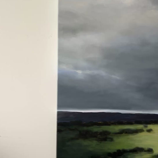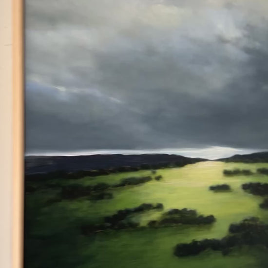 The landscape is filled greens and blue/grey hues that creates a moody landscape